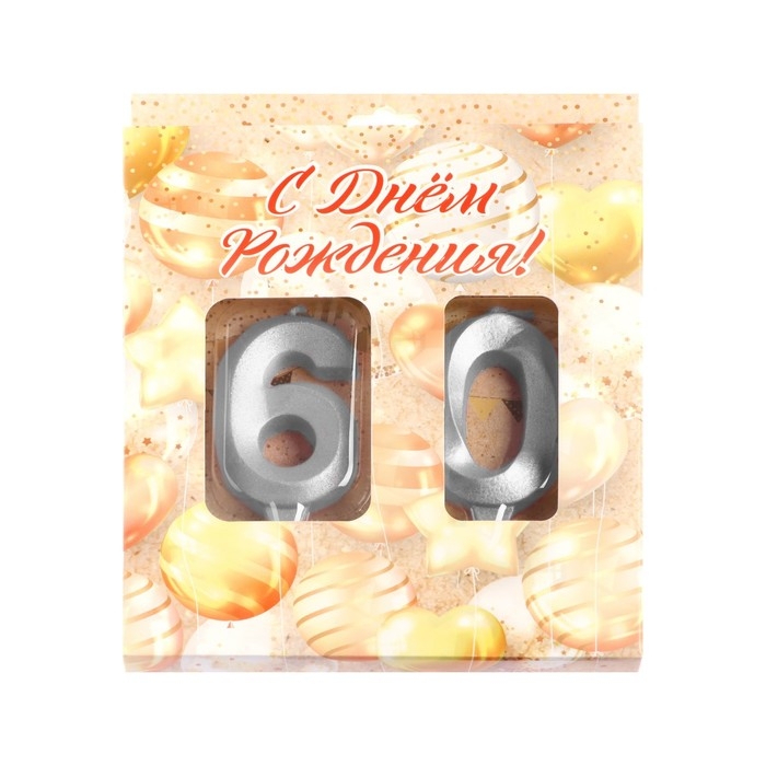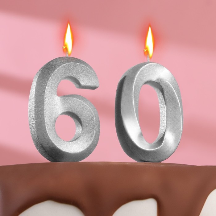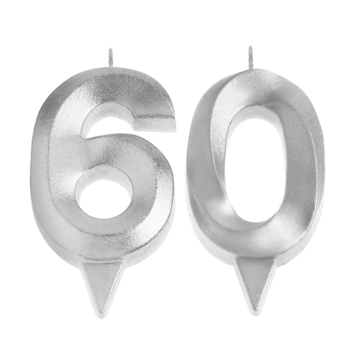 Свеча в торт юбилейная "Грань" (набор 2 в 1), цифра 60, серебряный металлик, 6,5 см