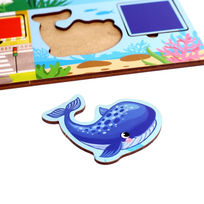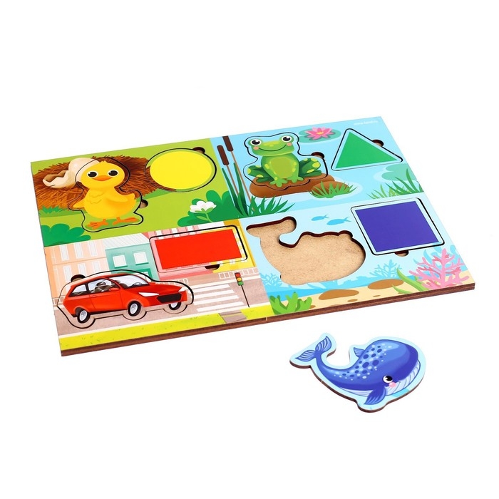 Данная головоломка поможет малышу улучшить сенсорное восприятие, а также изучить животных. Крохе предстоит соотнести элемент вкладки с подходящим отверстием в основе. Хотя эти упражнения кажутся довольно простыми, такие действия очень полезны для развития логического мышления.