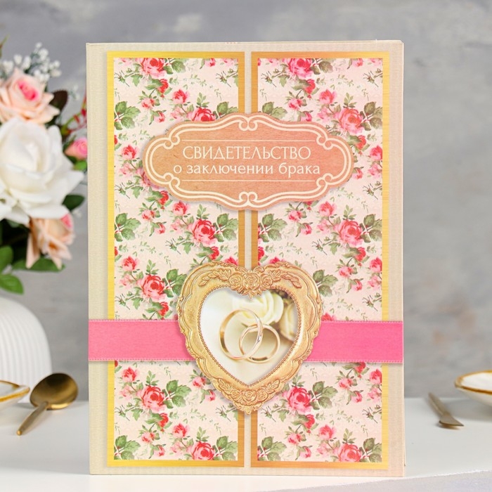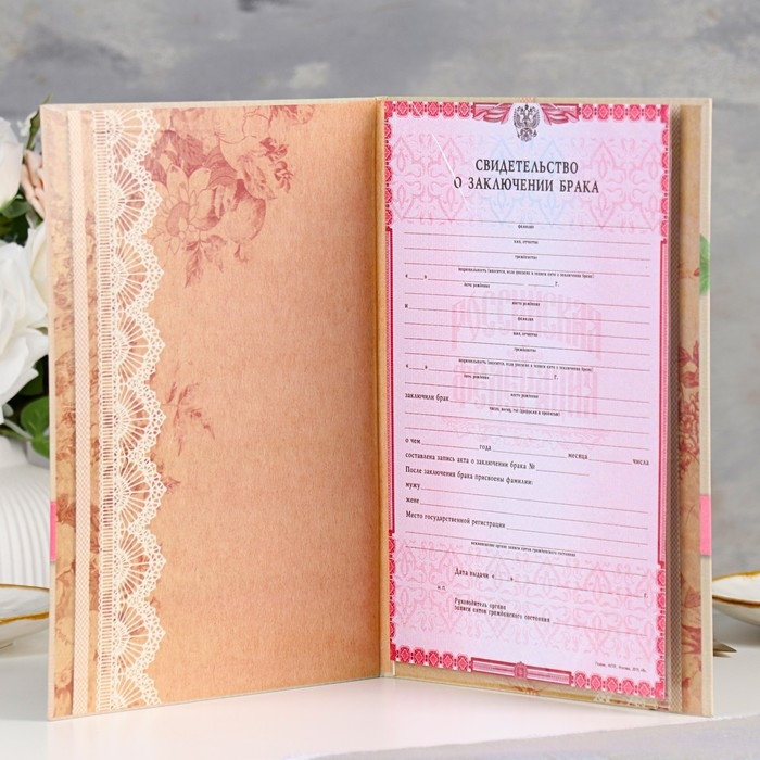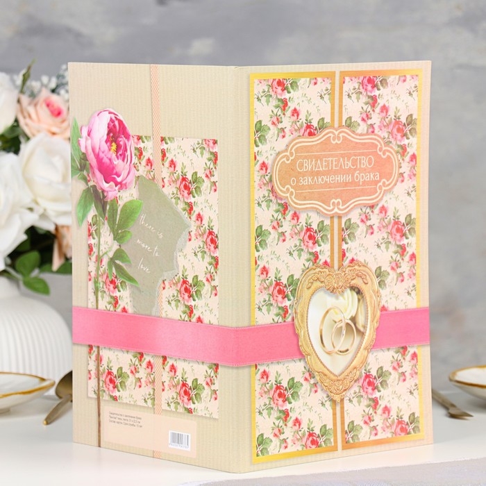 Свидетельство о заключении брака "Винтаж" софт тач, пион, лента, 31х22,5 см