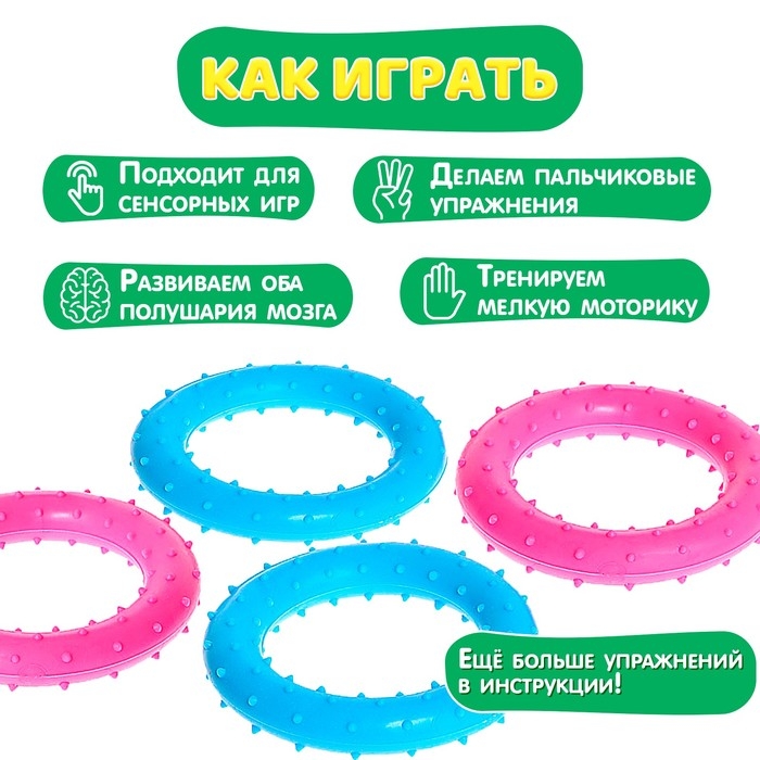 Развивающий набор «Тактильные колечки» поможет малышу укрепить мышцы рук и пальчиков, потренироваться проходить пальчиковые дорожки и выполнить нейроупражнения, способствующие стимуляции мозговой активности.