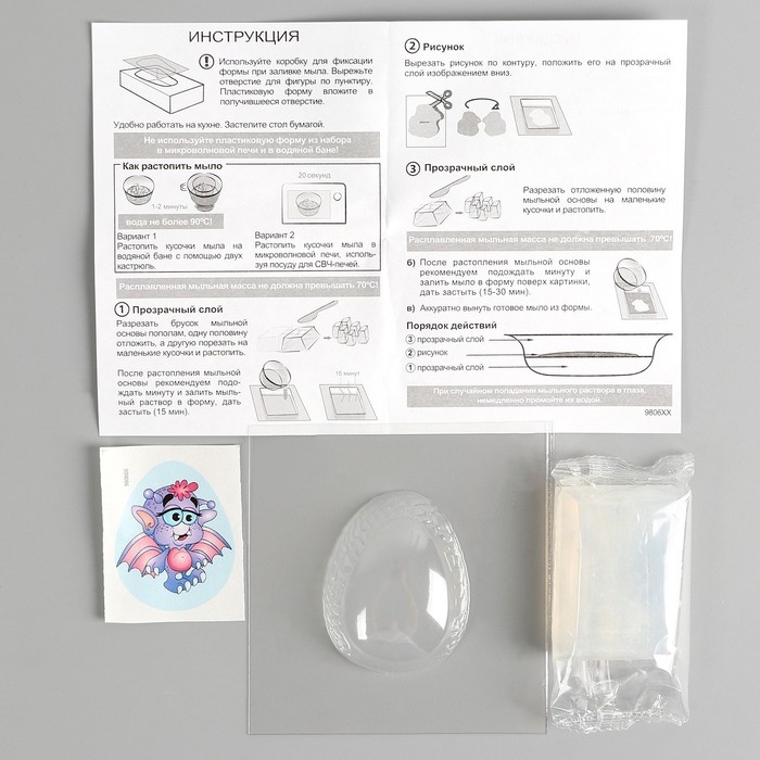 В набор входит: мыльная основа, формочка для отливки мыла, картинка, инструкция.
