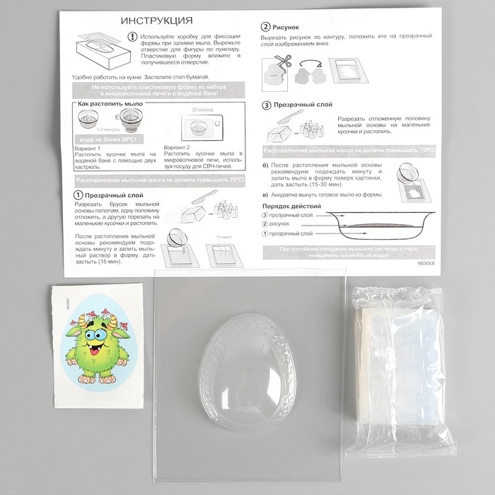 В набор входит: мыльная основа, формочка для отливки мыла, картинка, инструкция.