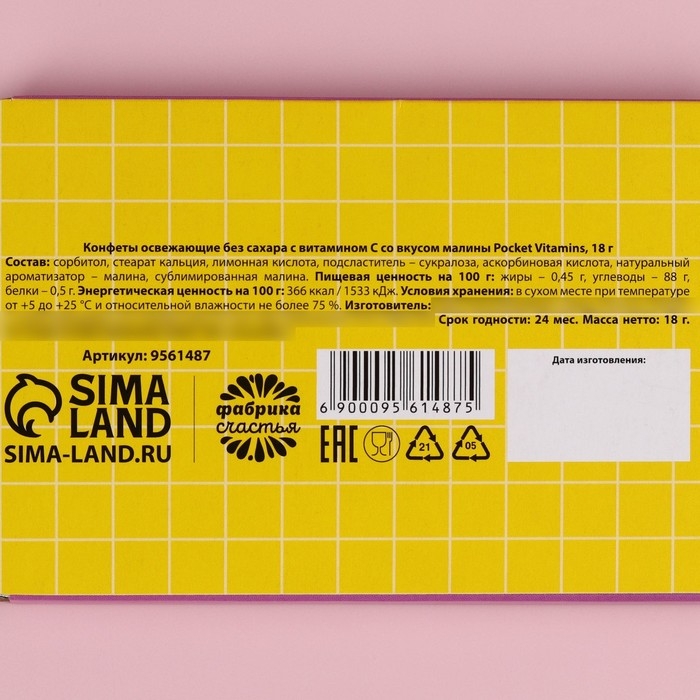 Состав: сорбитол, стеарат кальция, лимонная кислота, подсластитель - сукралоза, аскорбиновая кислота, натуральный ароматизатор - малина, сублимированная малина.