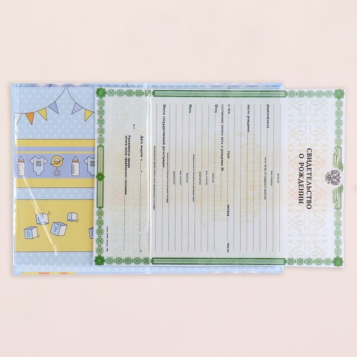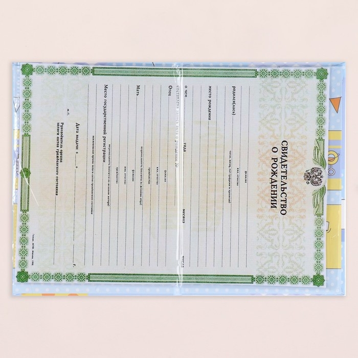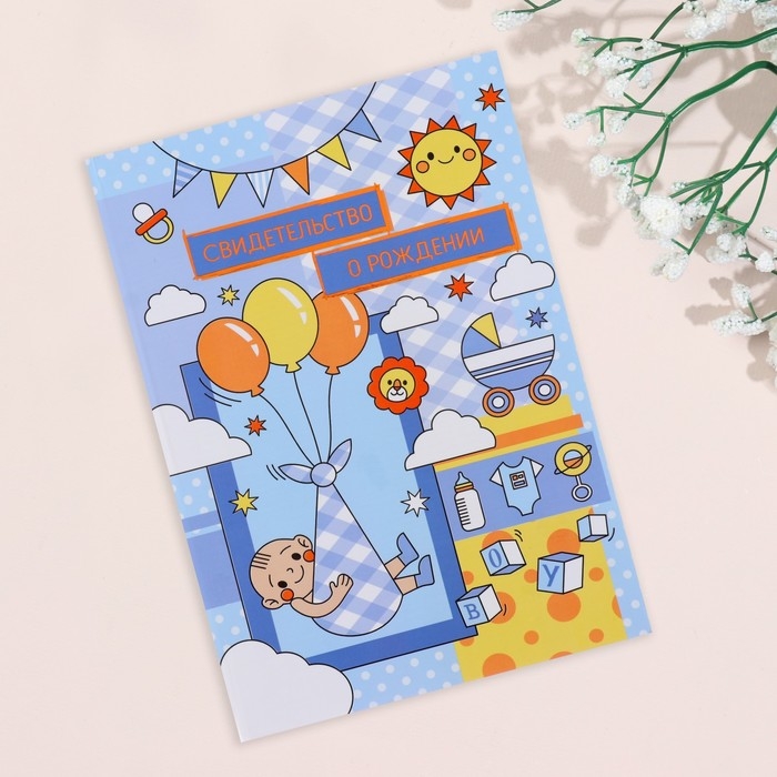 Свидетельство о рождении "Воздушные шары" тиснение, голубой фон, А5