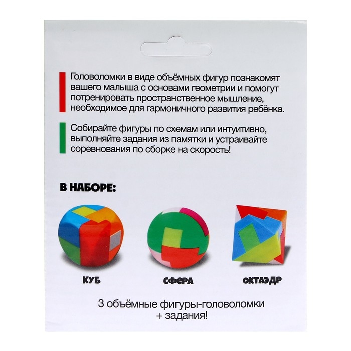 В наборе вы найдёте 3 цветных геометрических фигуры: куб, сферу, октаэдр.