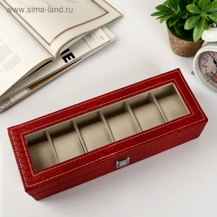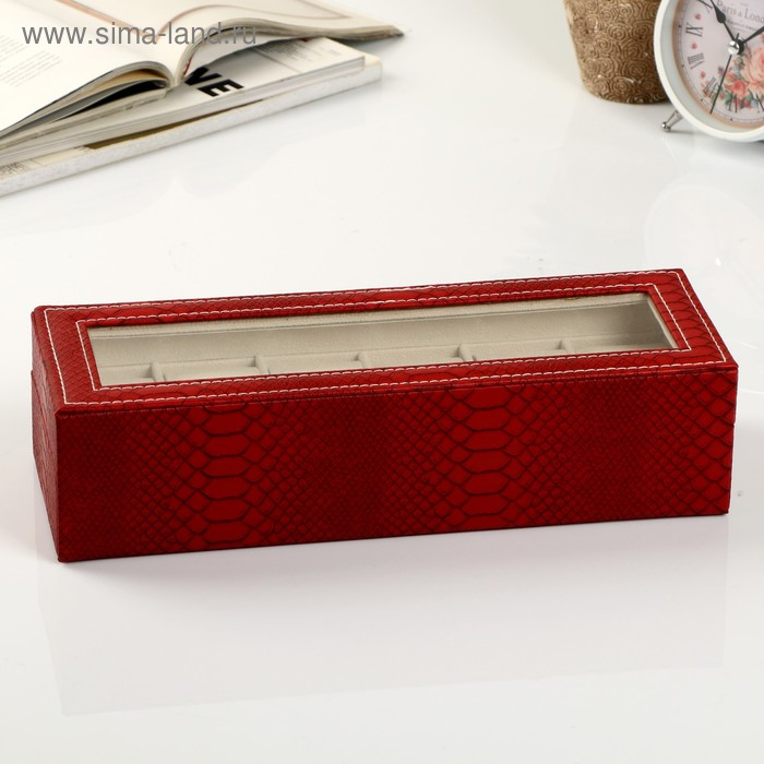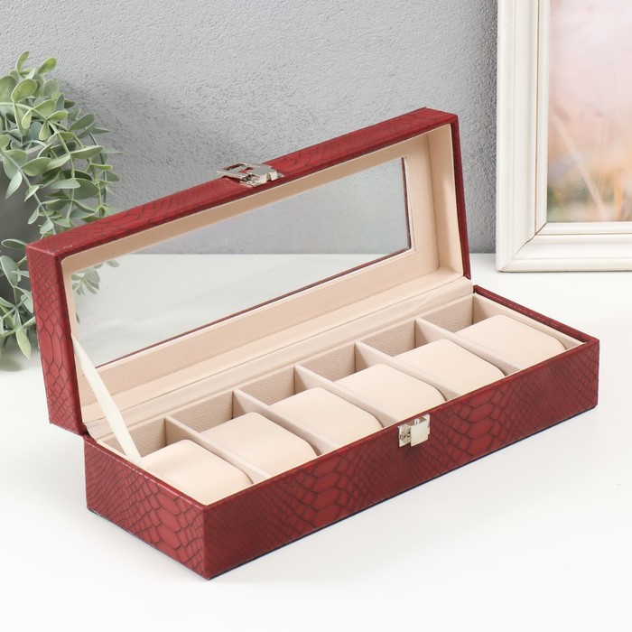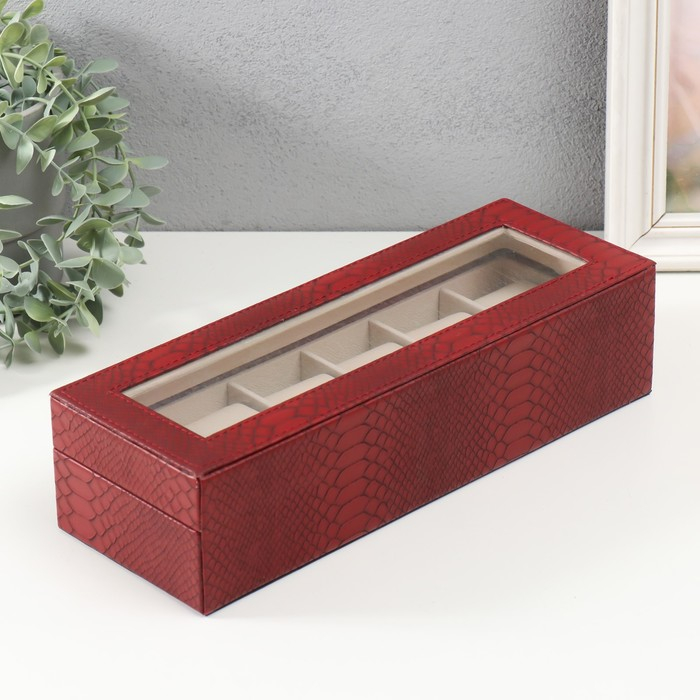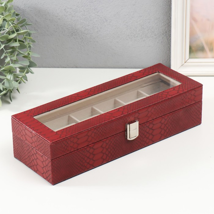Шкатулка кожзам под часы 6 отделений "Питон бордовый с прожилками" 11х31х7,5 см