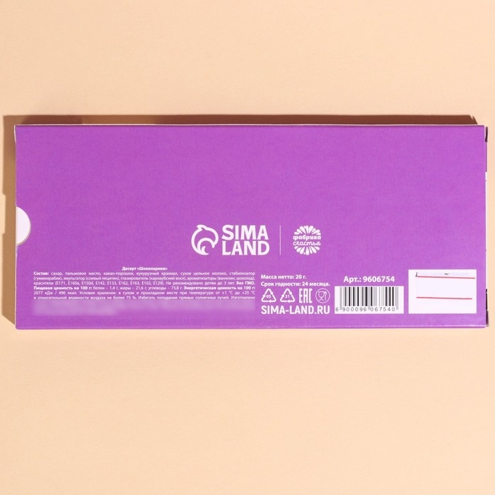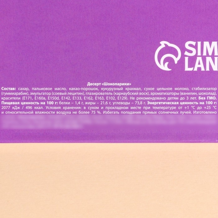 Состав: сахар, пальмовое масло, какао-порошок, кукурузный крахмал, сухое цельное молоко, стабилизатор (гуммиарабик), эмульгатор (соевый лецитин), глазирователь (карнаубский воск), ароматизаторы (ванилин, шоколад), красители (Е171, Е160а, Е150d, Е142, Е133, Е162, Е163, Е102, Е129).