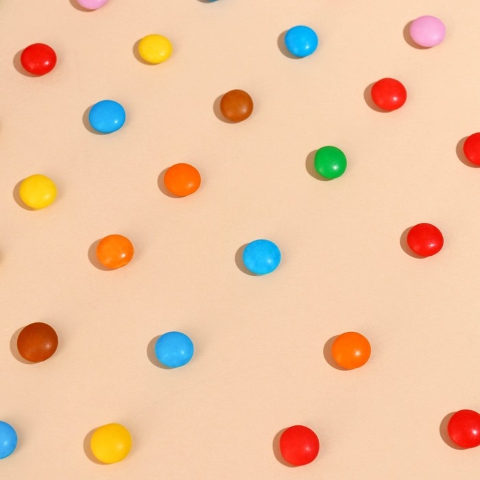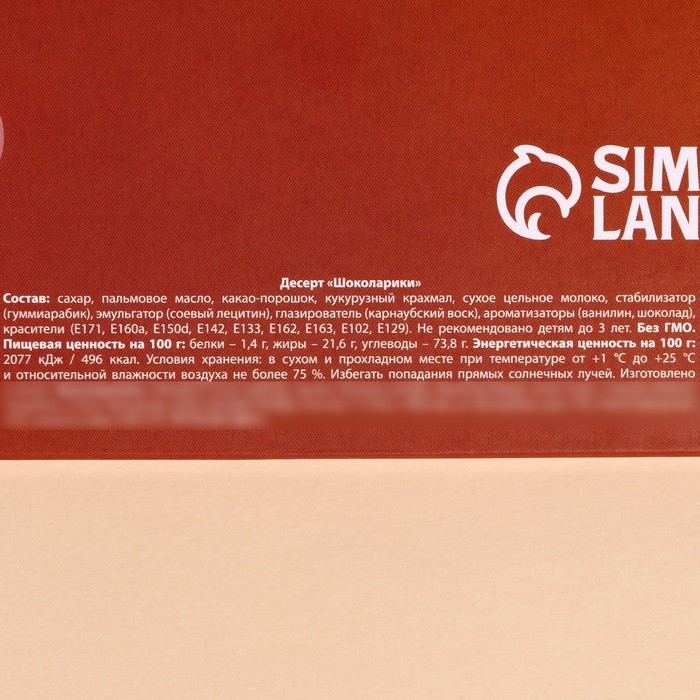 Состав: сахар, пальмовое масло, какао-порошок, кукурузный крахмал, сухое цельное молоко, стабилизатор (гуммиарабик), эмульгатор (соевый лецитин), глазирователь (карнаубский воск), ароматизаторы (ванилин, шоколад), красители (Е171, Е160а, Е150d, Е142, Е133, Е162, Е163, Е102, Е129).
