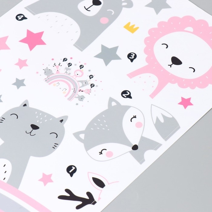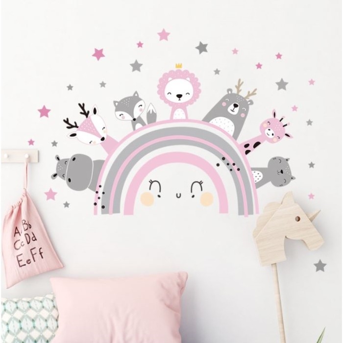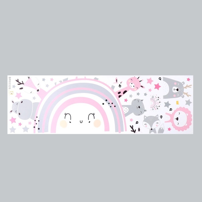 Наклейка пластик интерьерная цветная "Милые зверята на радуге" серо-розовый 30х90 см