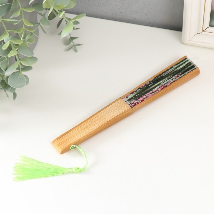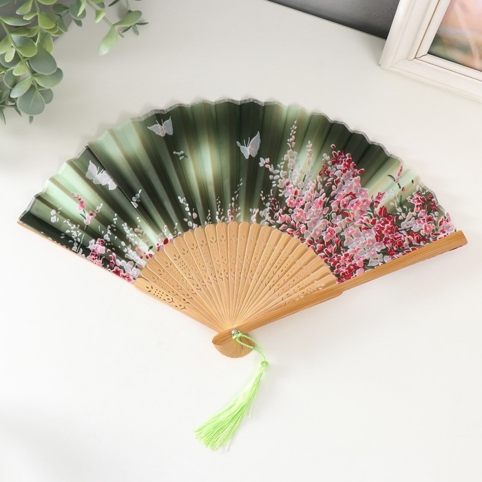 Веер дерево, текстиль h=21 см "Цветы и бабочки" зелёный, с кисточкой