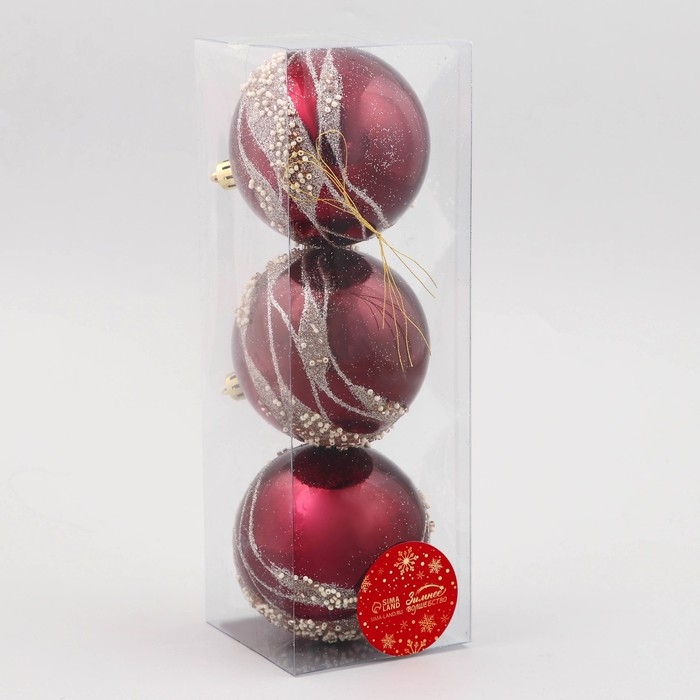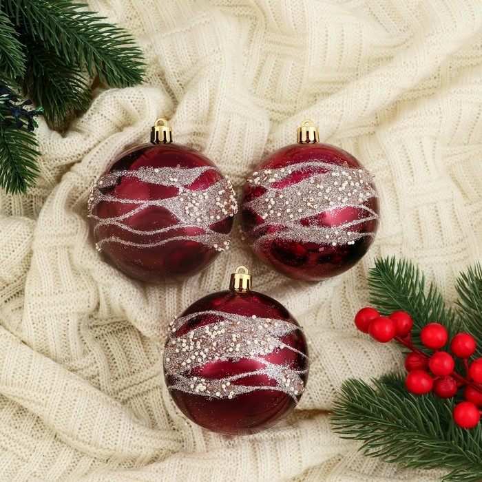 Набор шаров пластик d-8 см, 3 шт "Сказочные узоры" волны, бордовый