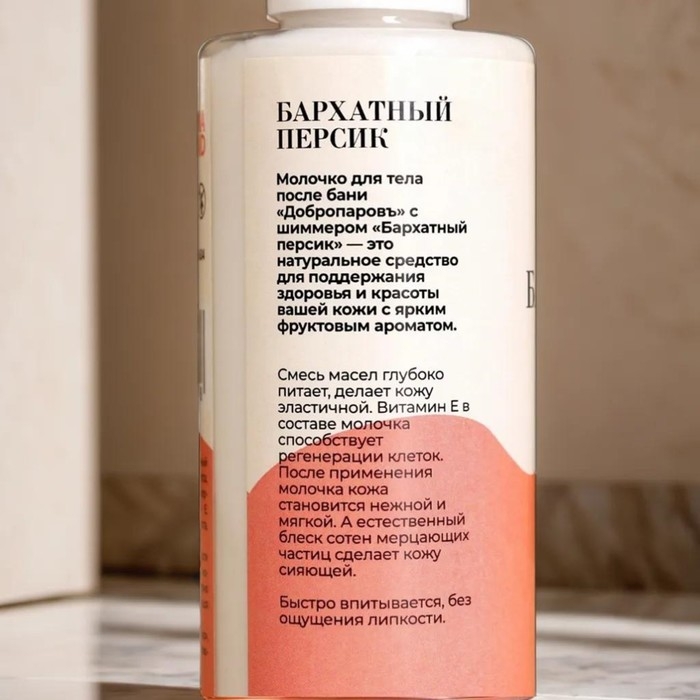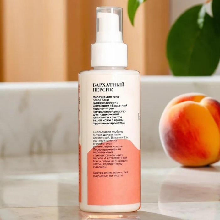Молочко для тела после бани "Добропаровъ" с шиммером "Бархатный персик" - это натуральное средство для поддержания здоровья и красоты вашей кожи с ярким фруктовым ароматом. Смесь масел глубоко питает, делает кожу эластичной. Витамин Е в составе молочка способствует регенерации клеток. После применения молочка кожа становится нежной и мягкой. А естественный блеск сотен мерцающих частиц сделает кожу сияющей. Быстро впитывается, без ощущения липкости.