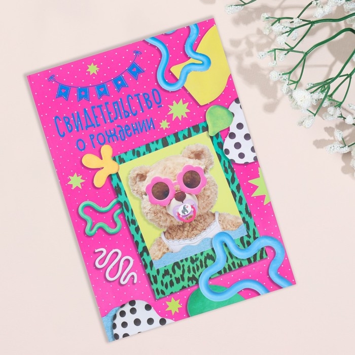 Свидетельство о рождении "Мишка" тиснение, очки, А5