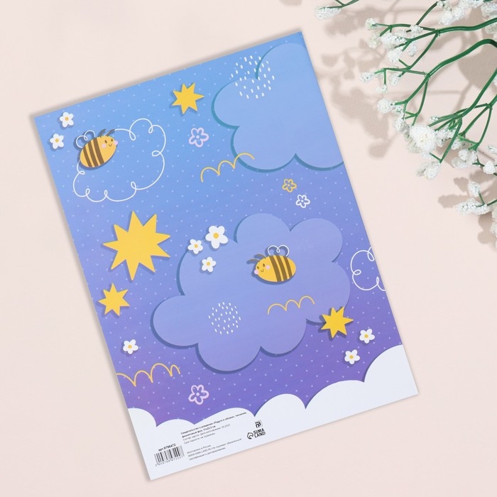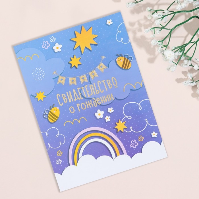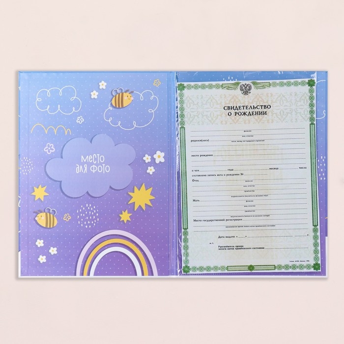 Свидетельство о рождении "Радуга и облака" тиснение, фиолетовый фон, А4