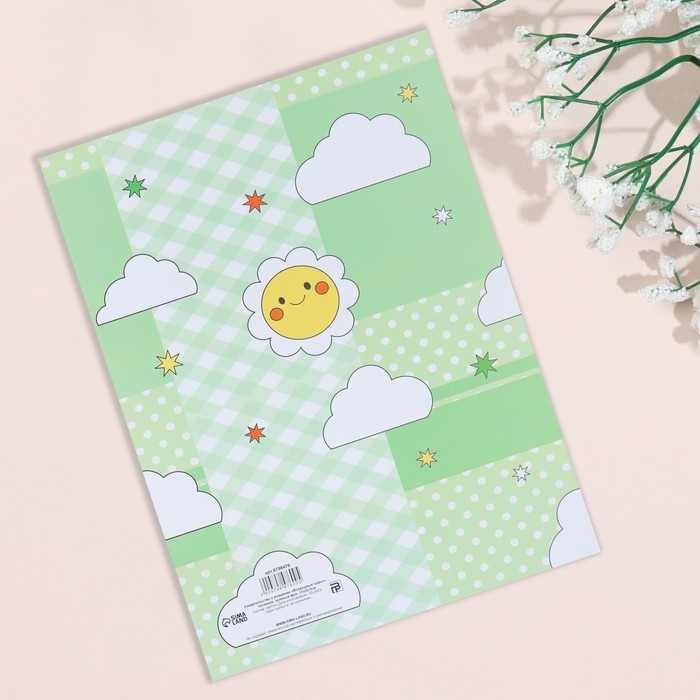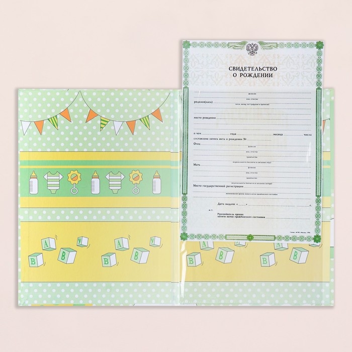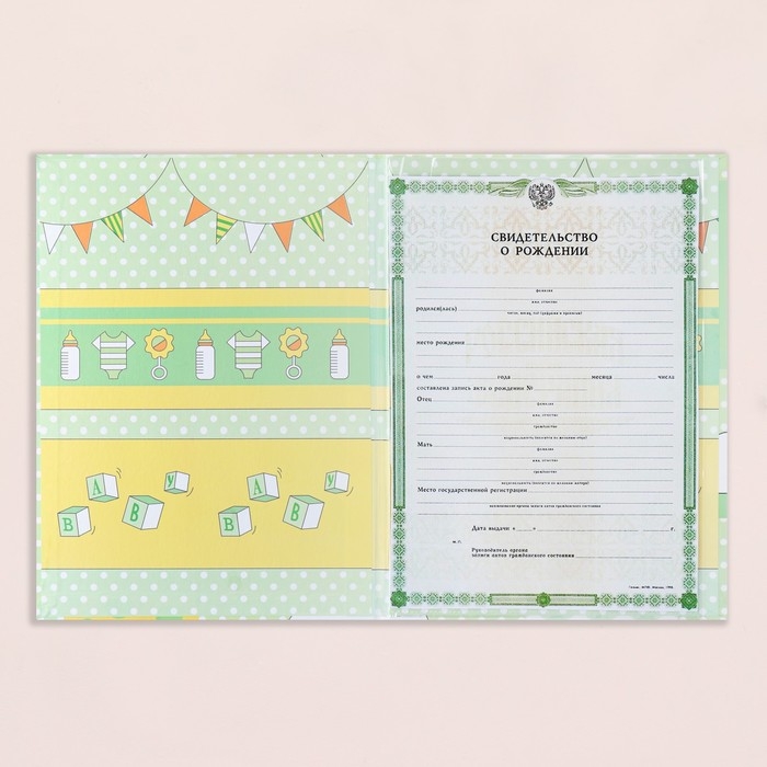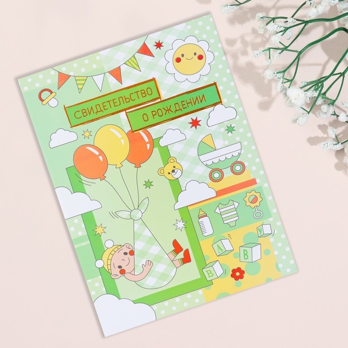 Свидетельство о рождении "Воздушные шары" тиснение, зеленый фон, А4