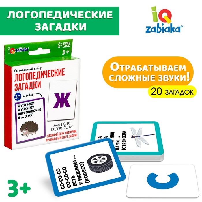 Развивающий набор «Логопедические загадки» поможет малышу в лёгкой игровой форме научиться правильно произносить сложные звуки: [Л], [Р], [Ж], [Ш], [С], [З].