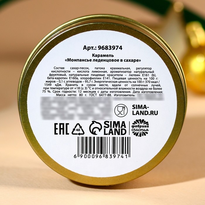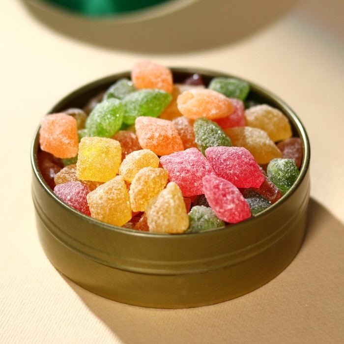 Состав: сахар-песок, патока крахмальная, регулятор кислотности - кислота лимонная, ароматизатор натуральный фруктовый, натуральные пищевые красители - лютеин Е161 (b), бета-каротин Е160а, хлорофиллин Е141.