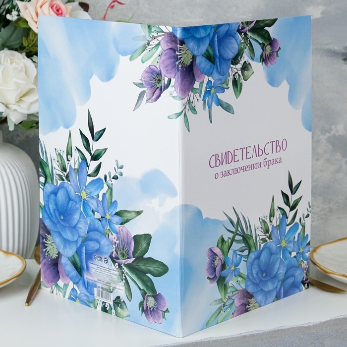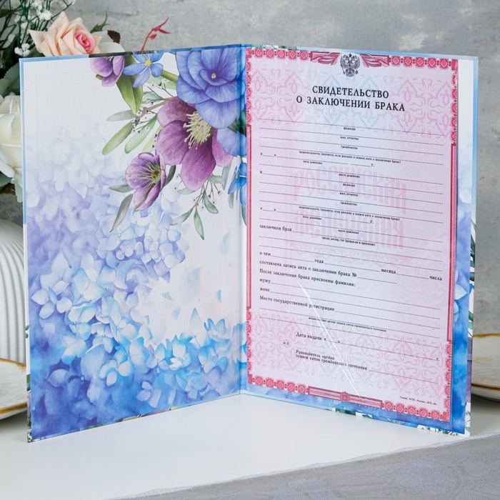 Свидетельство о заключении брака "Цветы" голубой фон, А4