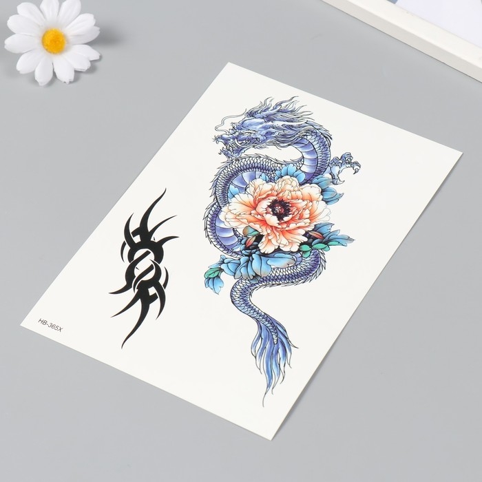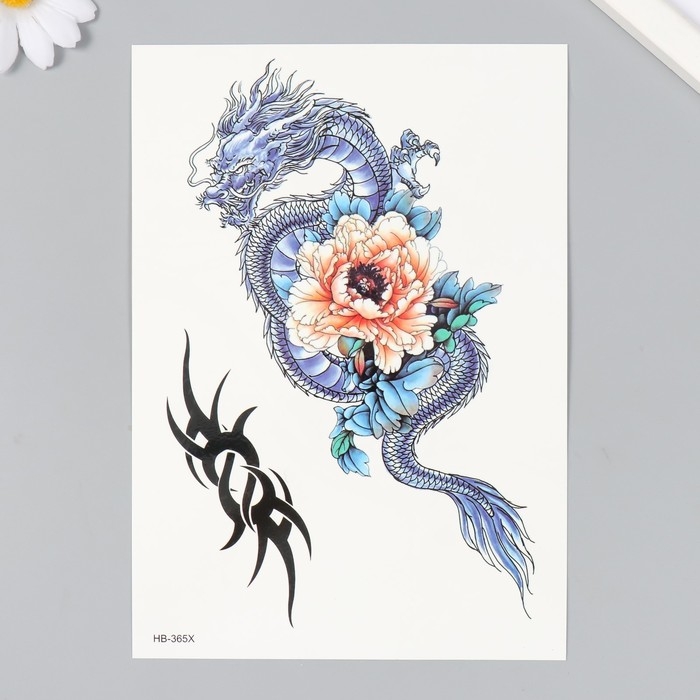 Татуировка на тело цветная "Дракон с пионом" 14,8х21 см