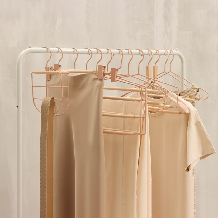 Вешалка – это компактное приспособление, которое позволит вам разместить в гардеробе классические штаны из лёгких или плотных материалов, блузки, рубашки, кофты и другие вещи. Изделие практичной формы занимает мало места, что позволяет экономить пространство в шкафу. Эргономичная форма поможет надёжно зафиксировать одежду и предотвратить её падение.