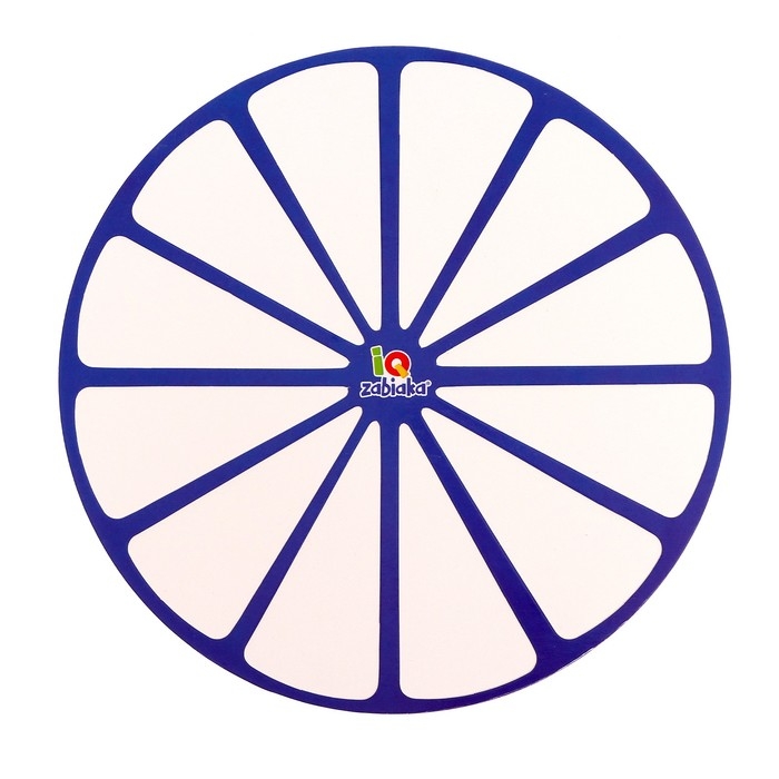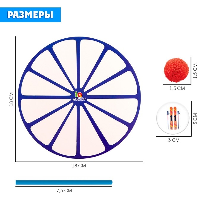 Внутри вы найдёте круг-тренажёр, 20 палочек, 15 карточек и 24 цветных бомбошки.