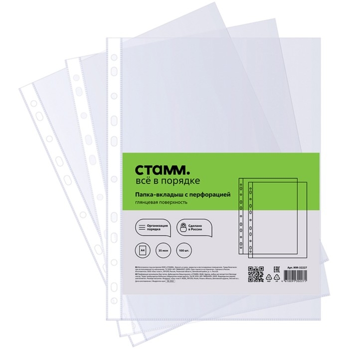 Файл-вкладыш А4, 35мкм, СТАММ, глянцевый, вертикальный, 100 штук