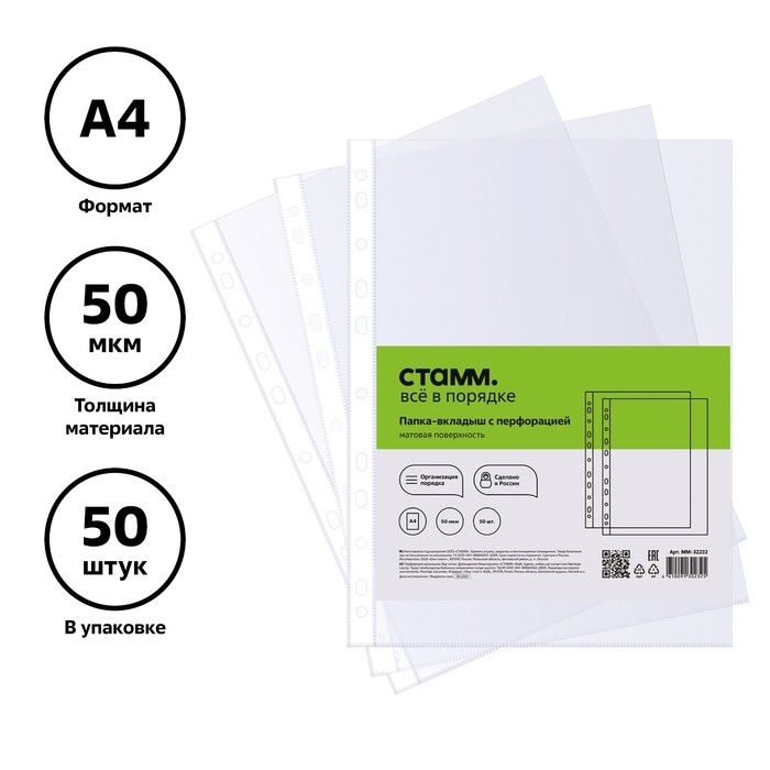 Файл-вкладыш А4, 50 мкм, Стамм, матовый, вертикальный, 50 штук