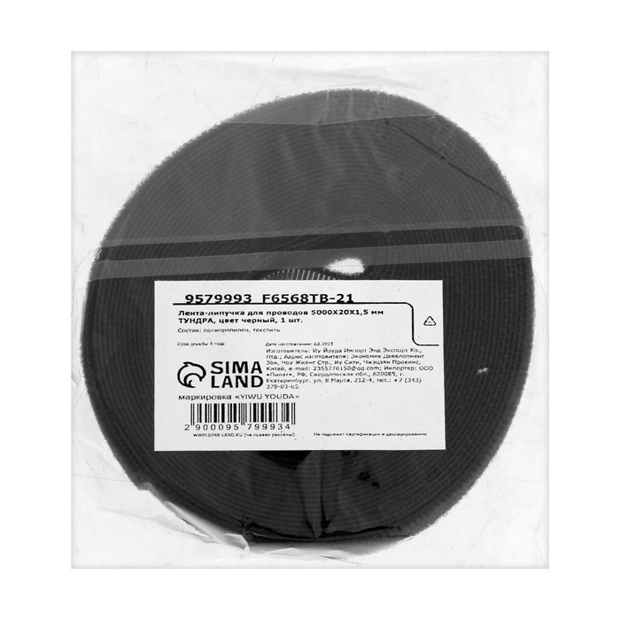 Лента-липучка для проводов 5000Х20Х1,5 мм ТУНДРА, цвет черный, 1 шт.