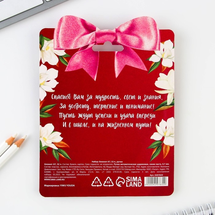 Подарочный набор блокнот «Золотому учителю», формат А7, 32 листа, ручка пластик,синяя паста