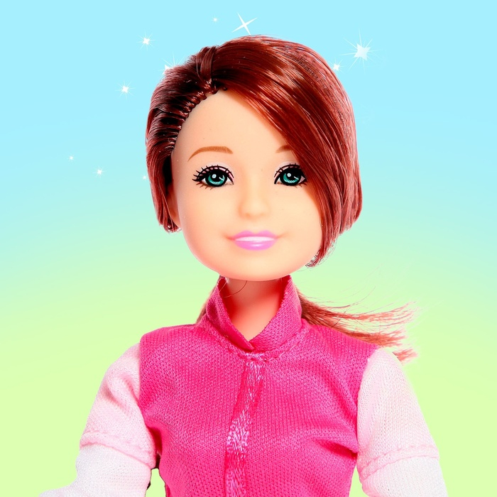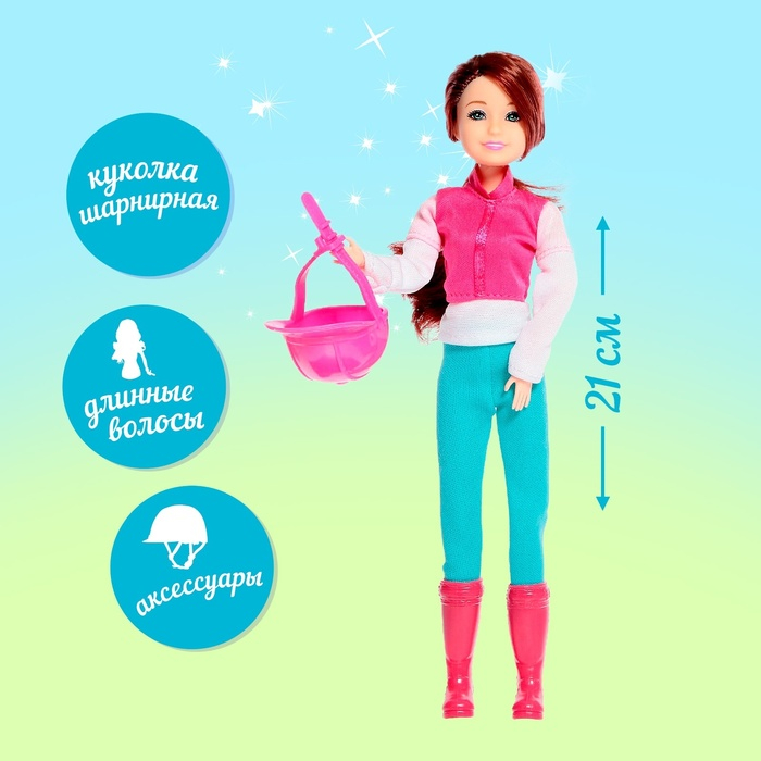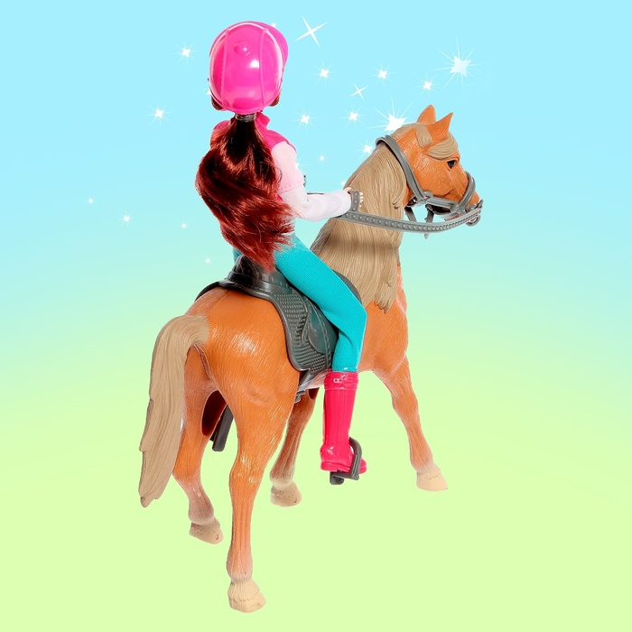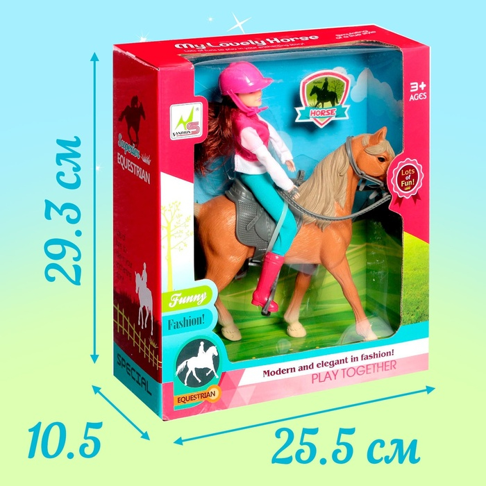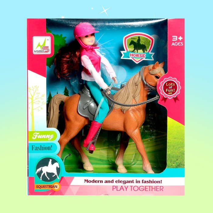 Этот набор станет желанным подарком для девочки. В комплект входит: кукла в форме для езды верхом, лошадка с седлом, уздой и поводком. У куколки длинные волосы. Ребёнок приберёт локоны и сделает самые красивые причёски.
