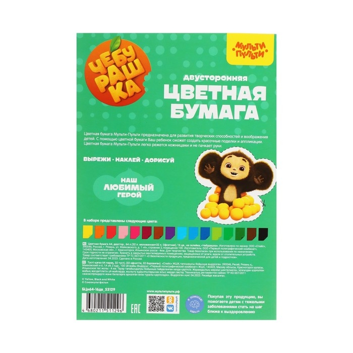 Цветная бумага двусторонняя А4, 16 цветов, 64 листа (32 листа мелованная + 32 листа офсетная), Мульти-Пульти "Чебурашка", на склейке