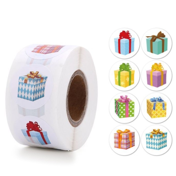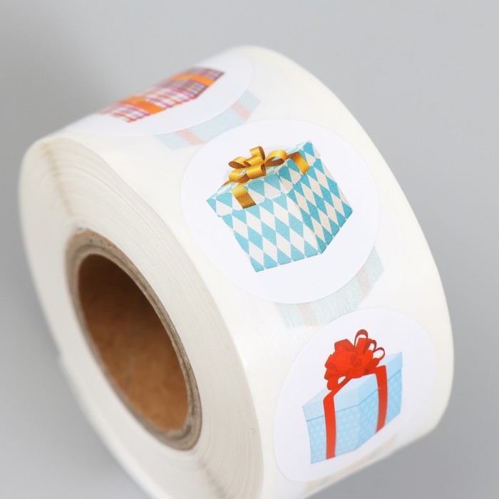 Наклейка бумага "Подарочки" d=2,5 см 500 шт в рулоне 3х6,5х6,5 см