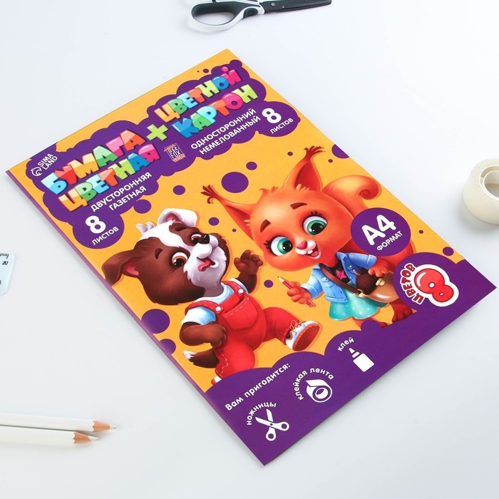 Набор цветного картона А4 8 листов (немелованный) и цветной бумаги 16 листов (газетная, двусторонняя) Мульти-Пульти "Чебурашка", на склейке
