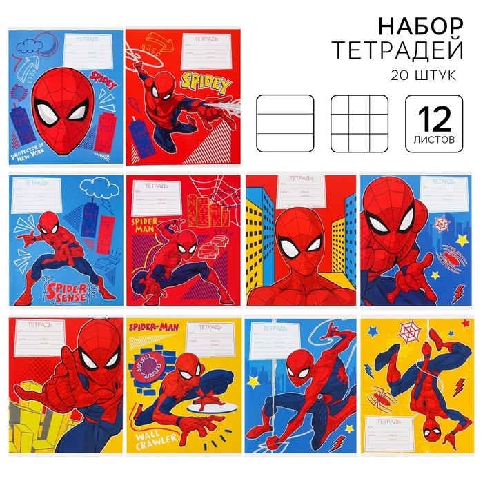 Набор тетрадей 20 штук, 12 листов, 1 сентября, 10 в клетку и 10 в линейку, обложка бумага мелованная, Человек-паук