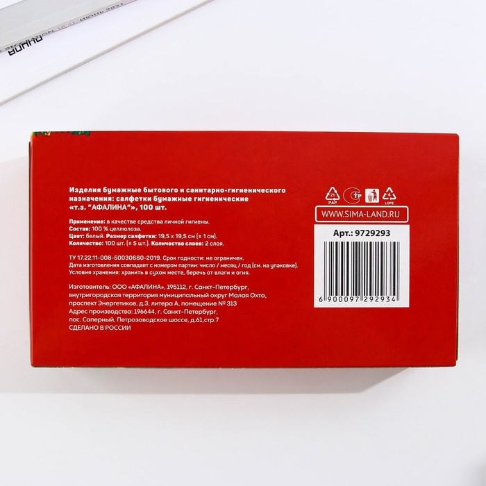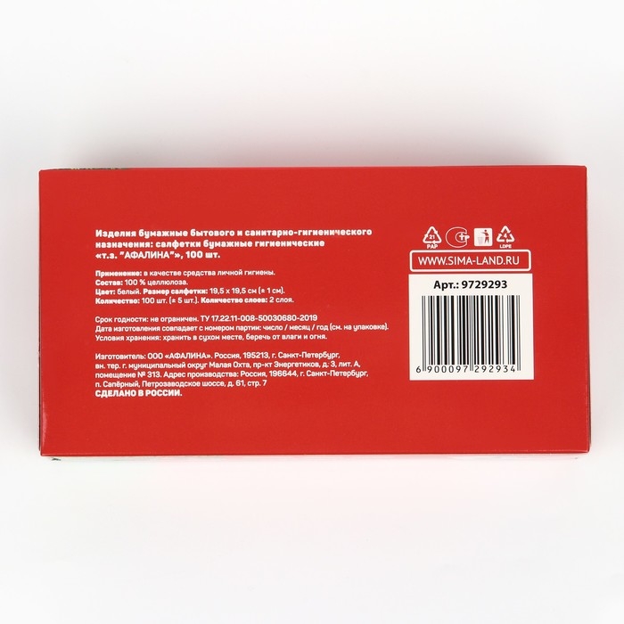 В упаковке 100 сухих бумажных двуслойных салфеток размером 20 х 20 см.