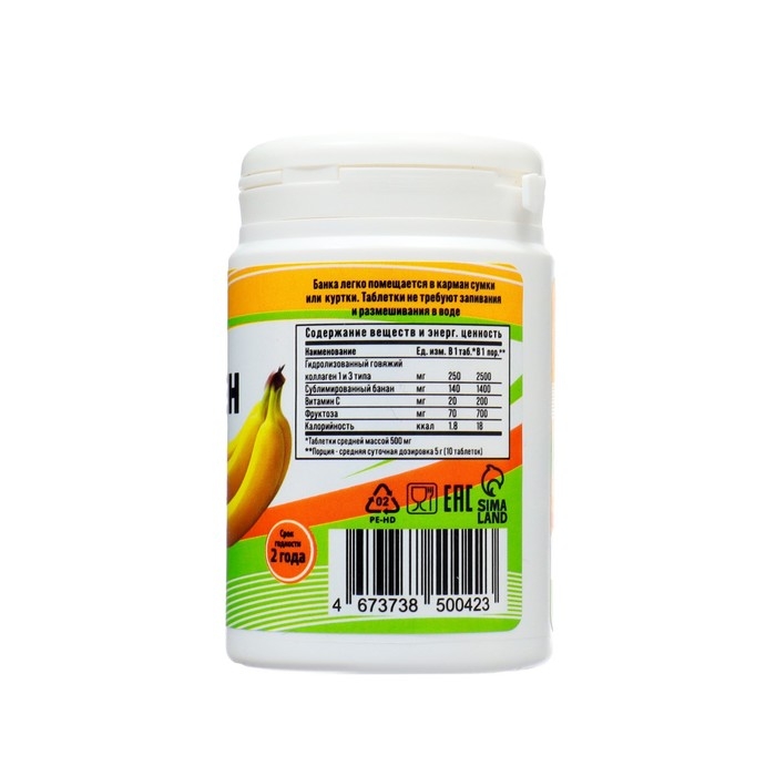 Состав: гидролизованный говяжий коллаген 1 и 3 типа, банан сублимированный, аскорбиновая кислота, диоксид кремния, стеарат магния, микроцеллюлоза.