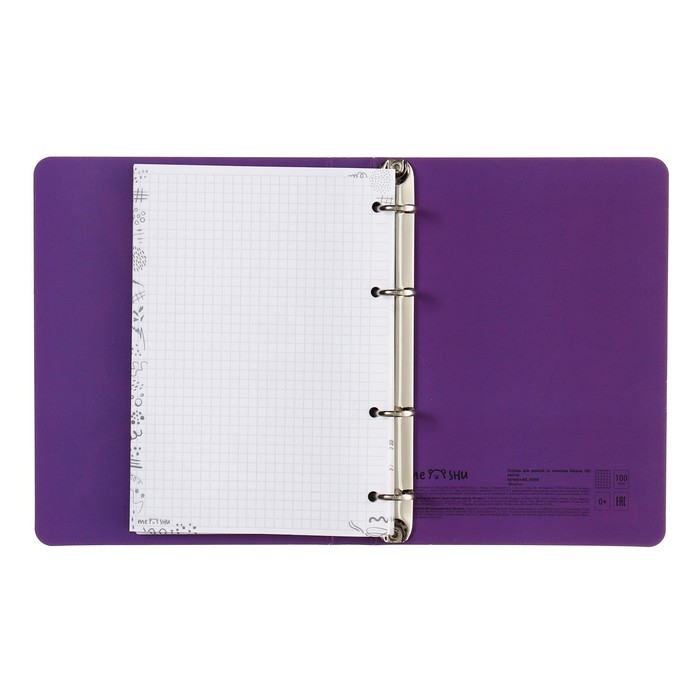 Тетрадь на кольцах удобна для большого объема записей. Легко вынимать и вставлять дополнительные листы. Блок - 100 листов из белой офсетной бумаги 65 гр/м2., белизной 100%. Линовка - клетка. Обложка тетради из плотного картона выделяется ярким дизайном и цветной запечаткой форзаца. Отделка обложки - матовая ламинация и тиснение фольгой.