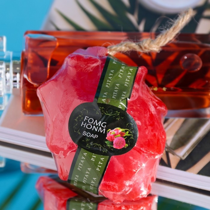 Мыло сделано в виде плода ярко-розового цвета. Вид экзотического фрукта доставит эстетическое удовольствие вашим глазам и приятные ощущения вашей коже. Мыло питает и увлажняет кожу благодаря природным компонентам, входящим в его состав. Обильная мягкая пена бережно очищает кожу, не стягивая ее.