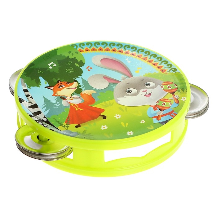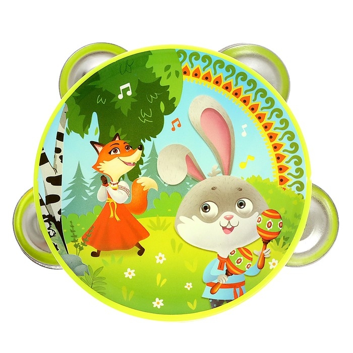 - Бубен имеет 8 металлических тарелок и отверстие, за которое малышу будет удобно держать игрушку. На инструменте есть красочная наклейка.