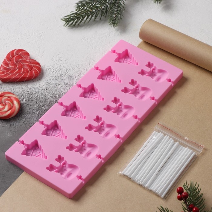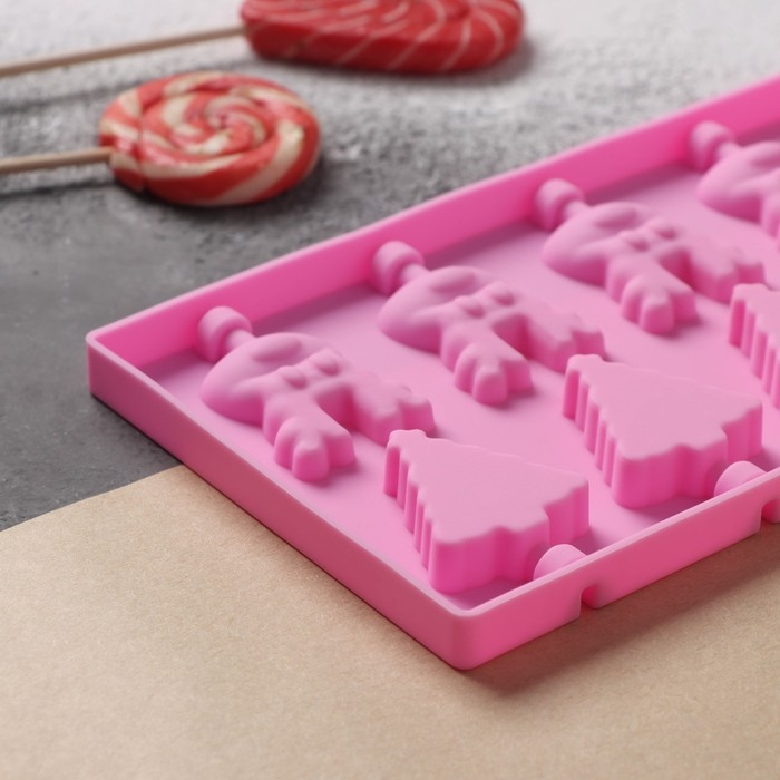 Форма для леденцов новогодняя Доляна «Новый год», силикон, 25×10,5×1 см, 12 ячеек, с палочками, цвет розовый