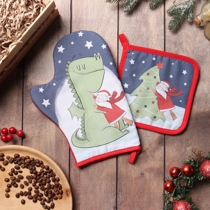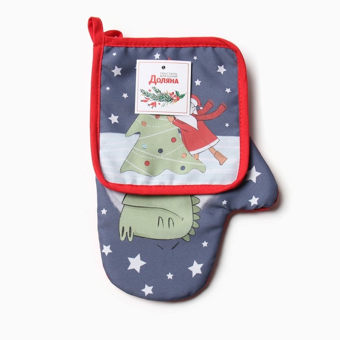 Новый год. Набор кухонный Доляна "Новогодние объятия": варежка 20х28 см, прихватка 17х17 см, 35% хл, 65% пэ
