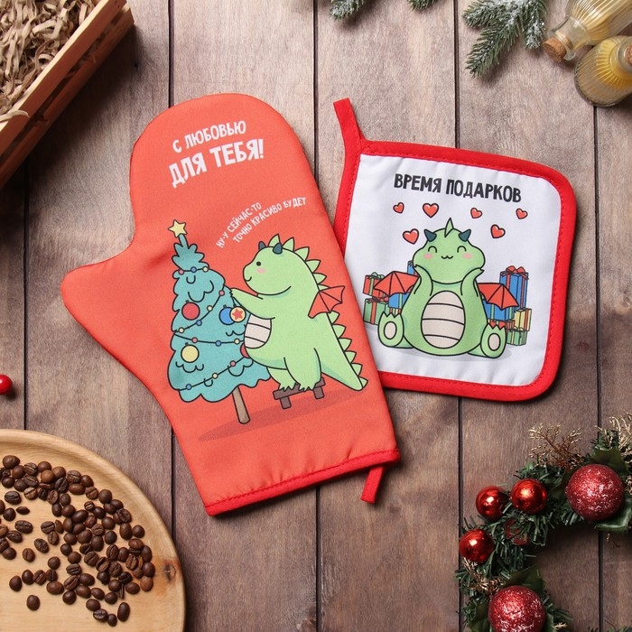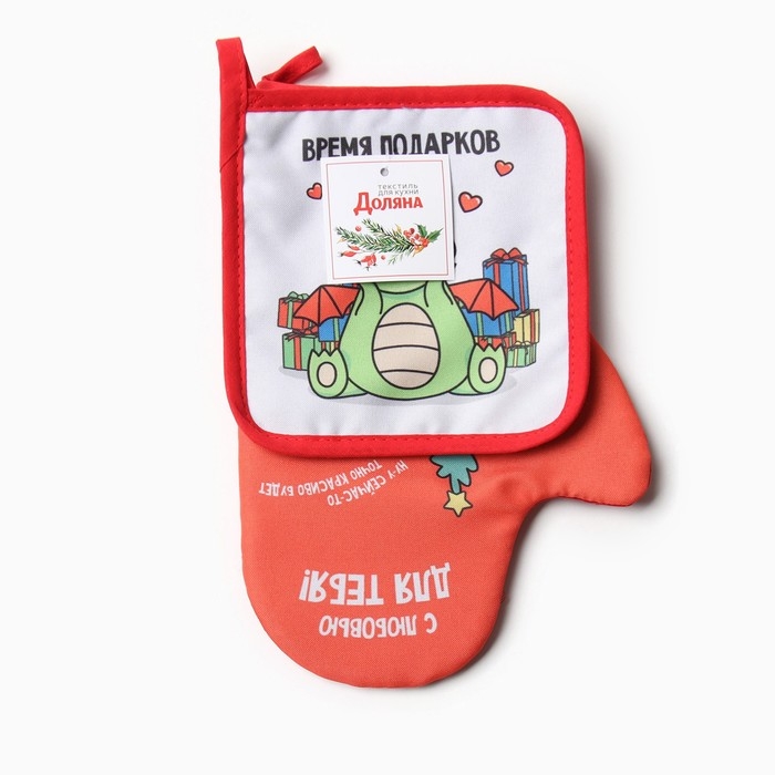 Новый год. Набор кухонный Доляна "Время подарков": варежка 20х28 см, прихватка 17х17 см, 35% хл, 65% пэ