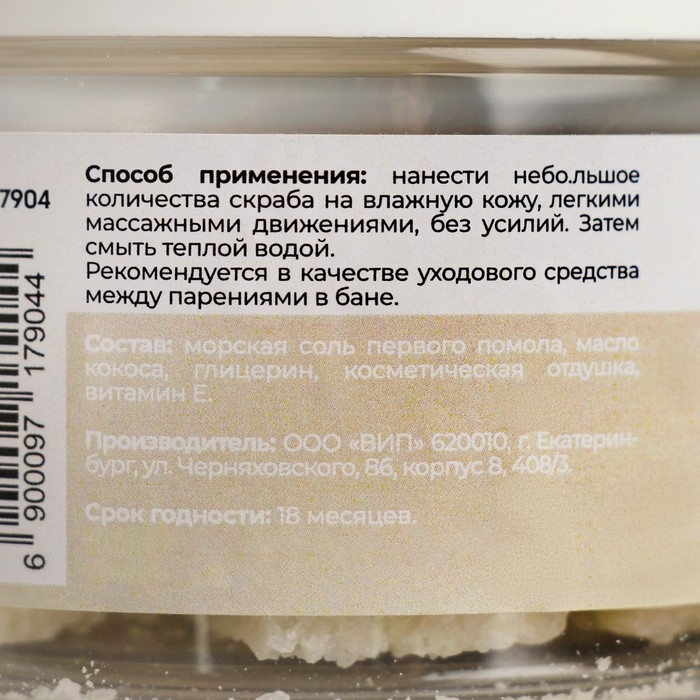 Скраб для тела представляет собой густую массу с мелкими частицами соли, которые легко распределяются по коже. После нанесения на кожу, скраб начинает действовать, удаляя омертвевшие клетки кожи и очищая ее.Благодаря содержанию белого мускуса, скраб имеет приятный аромат, который оставляет ощущение свежести и чистоты на коже. Также он содержит экстракты ромашки и календулы, которые оказывают успокаивающее и увлажняющее действие на кожу.