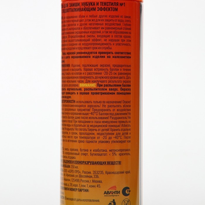 Аэрозоль-краска предназначена для восстановления и усиления яркости цвета, закрашивания потертостей, придания ухоженного вида и повышения водоотталкивающих свойств замши, нубука, велюра.