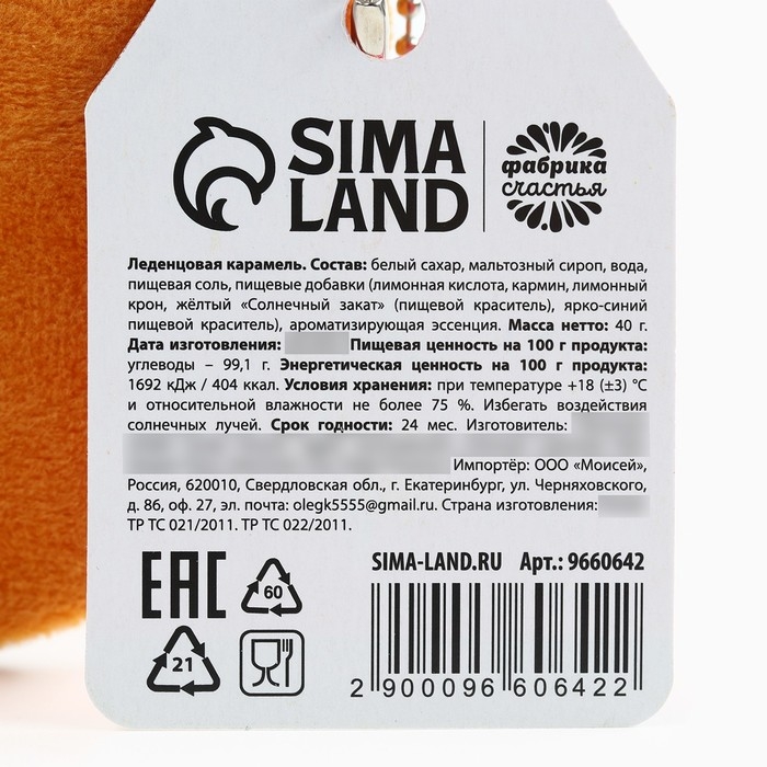 Состав: Белый гранулированный сахар, мальтозный сироп, пищевые добавки (лимонная кислота, красный очаровательный АС (пищевой краситель), лимонно - жёлтый (пищевой краситель), бриллиантовый синий (пищевой краситель), эритрозин), ароматизирующая пищевая эссенция.