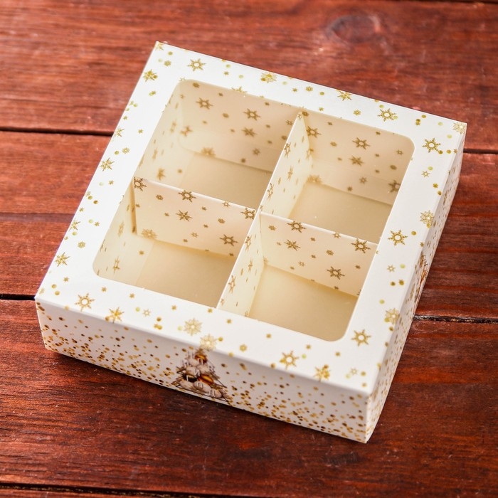 Новый год. Коробка для конфет 4 шт "Золотые звёзды" подарочная новогодняя упаковка, 12,6 х 12,6 х 3,5 см.