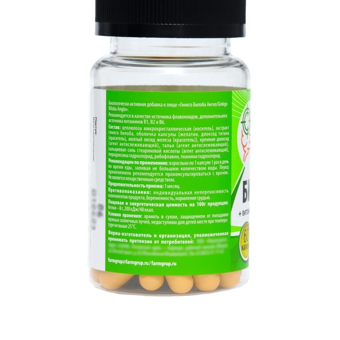 Состав: Целлюлоза микрокристаллическая (носитель), экстракт гинкго билоба, оболочка капсулы (желатин, диоксид титана (краситель), желтый оксид железа (краситель)), кремния диоксид (агент антислеживающий), тальк (агент антислеживающий), кальциевая соль стеариновой кислоты (агент антислеживающий), пиридоксина гидрохлорид, рибофлавин, тиамина гидрохлорид.