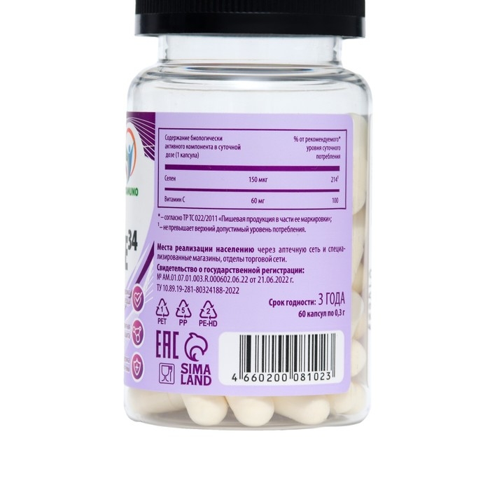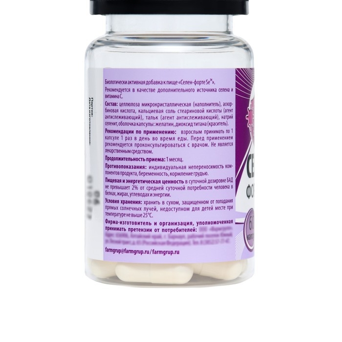 Состав: Целлюлоза микрокристаллическая (наполнитель), аскорбиновая кислота, кальциевая соль стеариновой кислоты (агент антислеживающий), тальк (агент антислеживающий), натрий селенит, оболочка капсулы: желатин, диоксид титана (краситель).