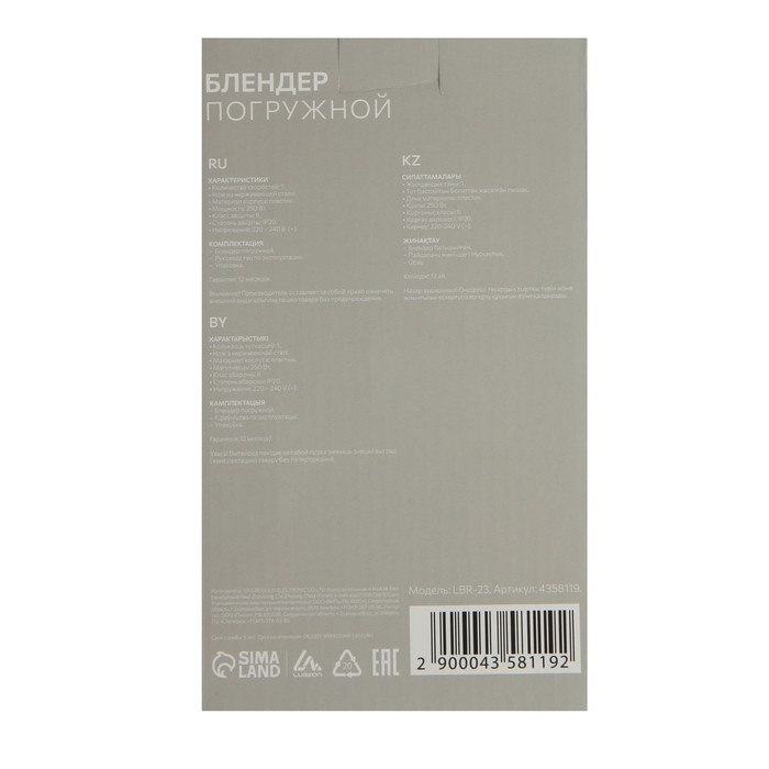 Блендер Luazon LBR-23, погружной, 250 Вт, 1 скорость, бело-фиолетовый
