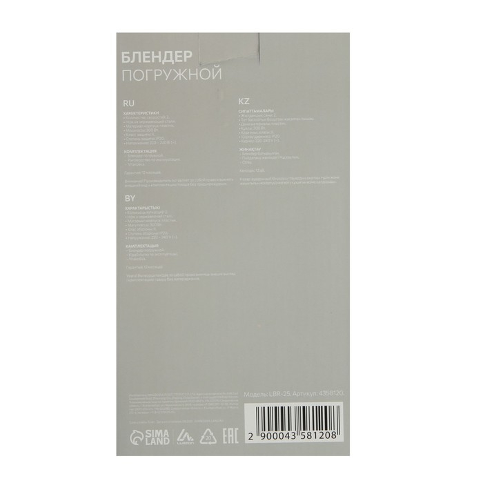 Блендер Luazon LBR-23, погружной, 250 Вт, 1 скорость, бело-фиолетовый
